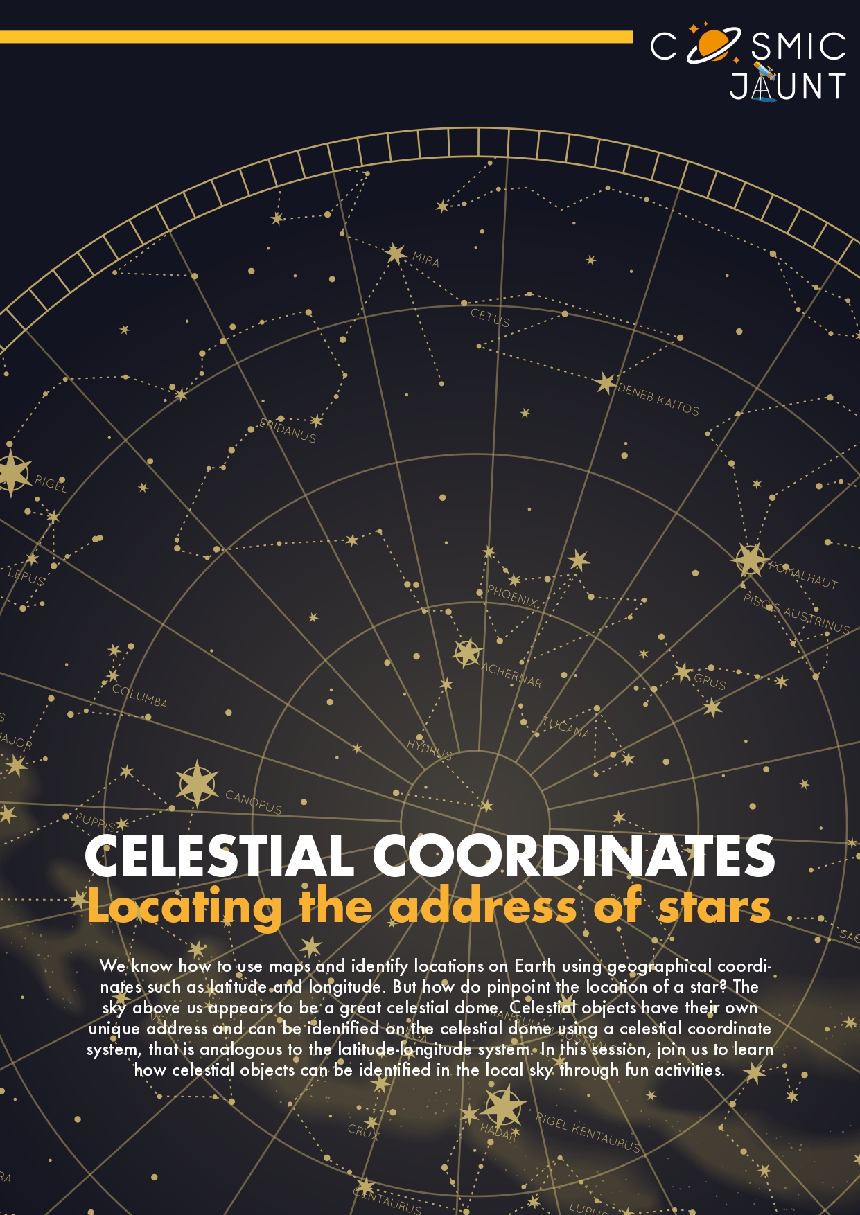 We know how to use maps and identify locations on Earth using geographical coordinates such as latitude and longitude. But how to pinpoint the location of a star? The sky above us appears to be a great celestial dome. Celestial objects have their own unique address and can be identified on the celestial dome using a celestial coordinate system, that is analogous to the latitude