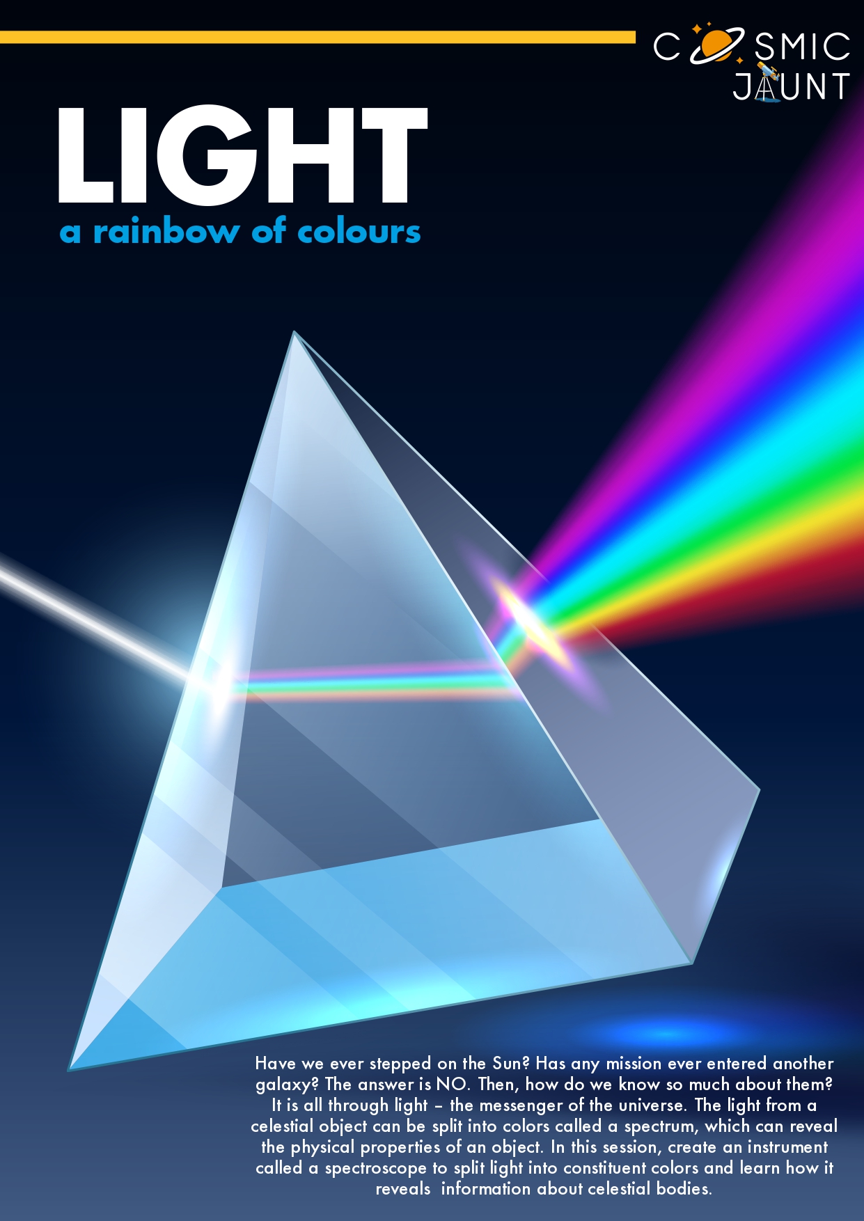 Have we ever stepped on the Sun? Has any mission ever entered another galaxy? The answer is NO. Then, how do we know so much about them? It is all through light – the messenger of the universe. The light from a celestial object can be split into colors called a spectrum, which can reveal the physical properties of an object